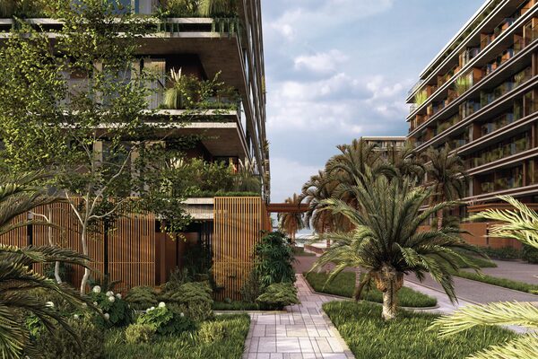 Из панорамных окон апартаментов открываются захватывающие виды на море и благоустроенные внутренние дворы, украшенные пальмами и прогулочными аллеями. На территории предусмотрены просторные бассейны и зоны отдыха, создающие атмосферу курорта 24/7.